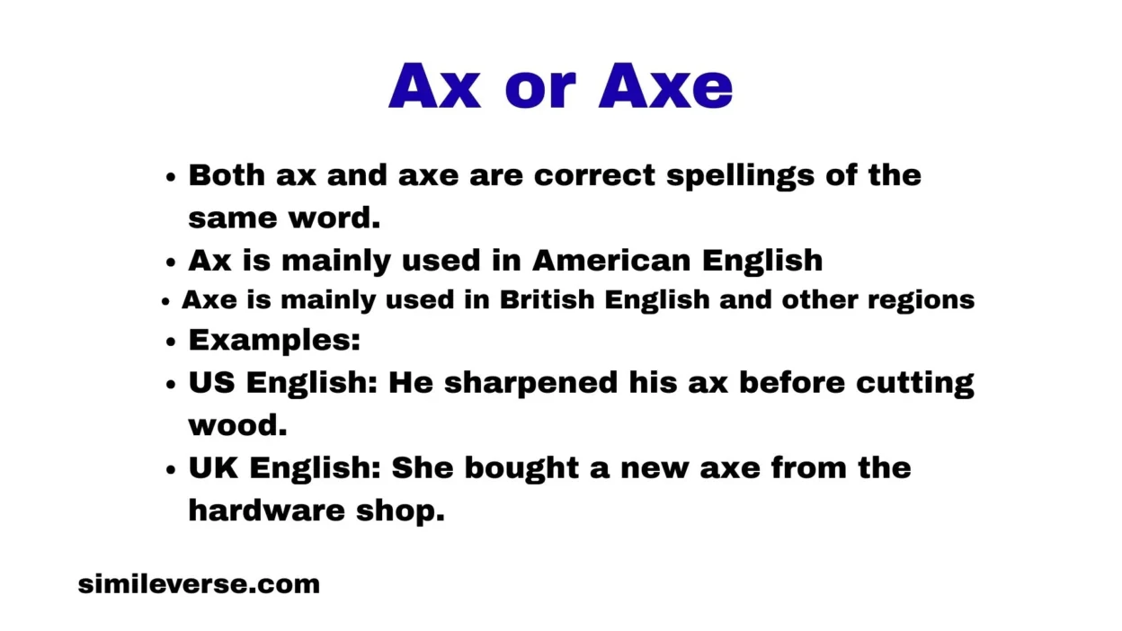 This article clears up that confusion once and for all. Youโll get a quick answer, learn where the word came from, see how spelling changes by region, and find out which version you should use. By the end, youโll know exactly when to write ax and when to write axeโwith confidence.