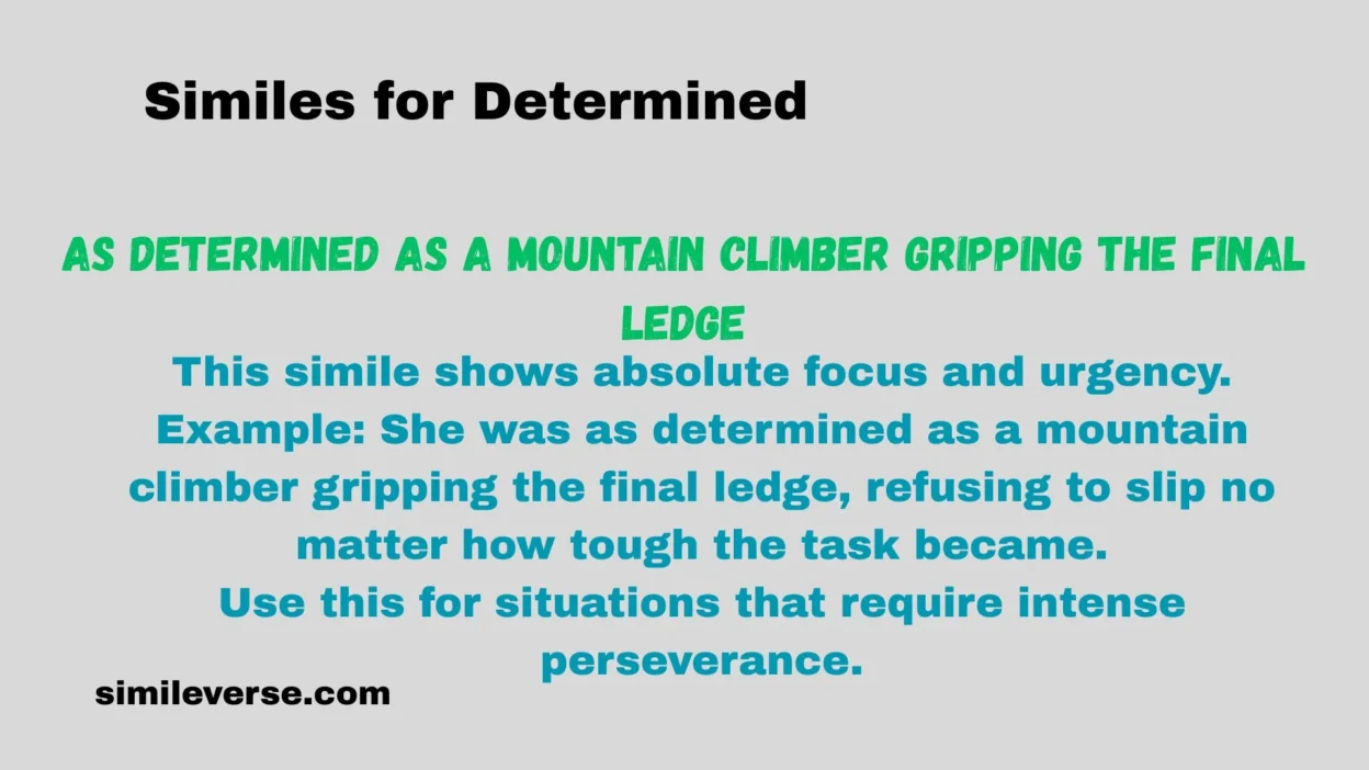 Example: She was as determined as a mountain climber gripping the final ledge, refusing to slip no matter how tough the task became.