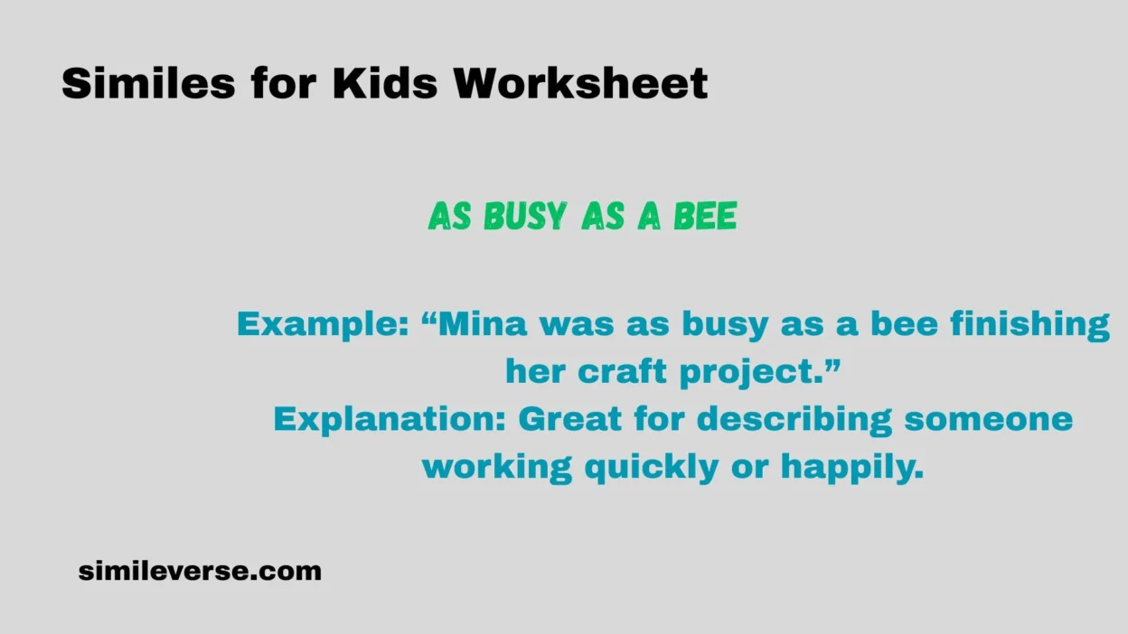 Example: “Mina was as busy as a bee finishing her craft project.”