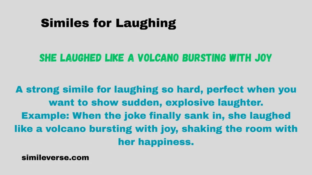 Example: When the joke finally sank in, she laughed like a volcano bursting with joy, shaking the room with her happiness.