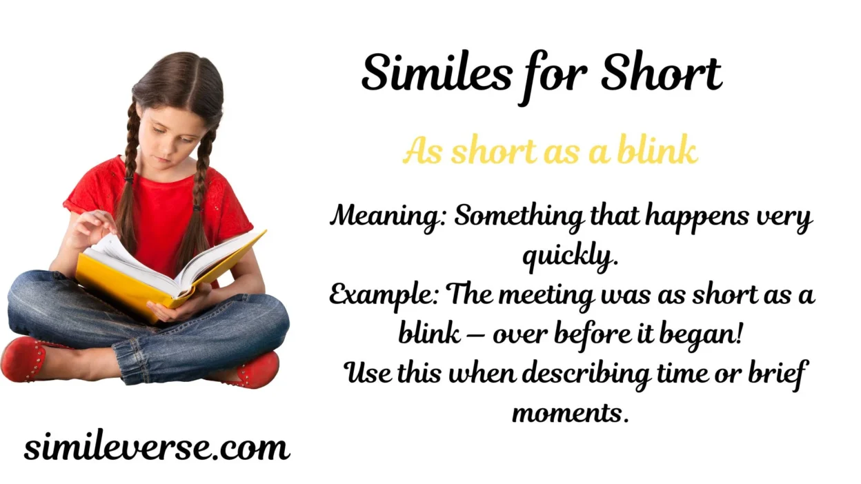 When we use similes for short, we describe something or someone’s small size, height, or length in an imaginative, funny, or expressive way. They can make descriptions more engaging and help readers visualize what you mean — whether it’s a short person, a short object, or even a short moment of time.