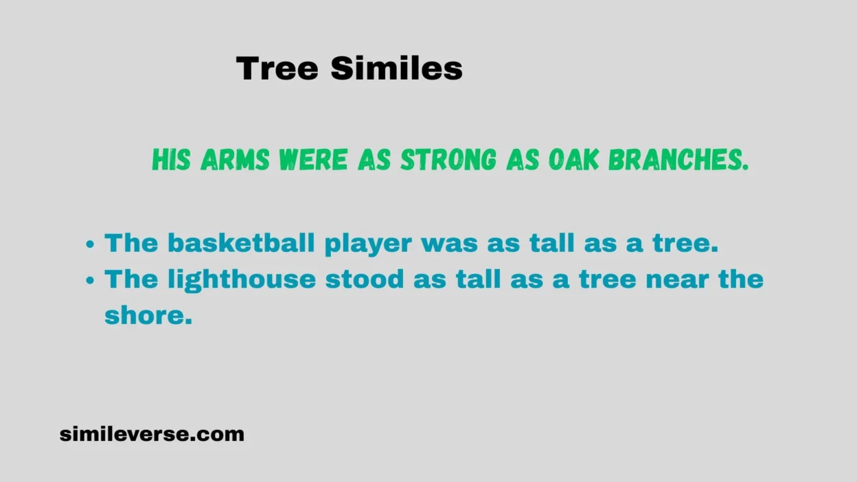 Tree similes are comparisons that describe something by relating it to a tree. Trees are tall, strong, steady, and peaceful—so they make great examples in writing.